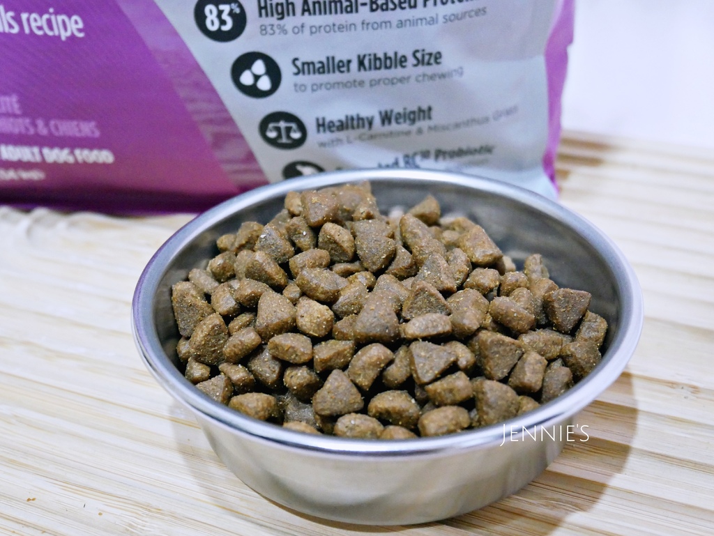 而這款跟其他兩款相比,是小型犬最適合食用的大小,不過就算是全能犬的飼料大小,適口性還是很不錯的,也剛好可以讓哈比學習啃咬,不然太小的飼料基本上它都是直接吞掉(是有多餓啦!)